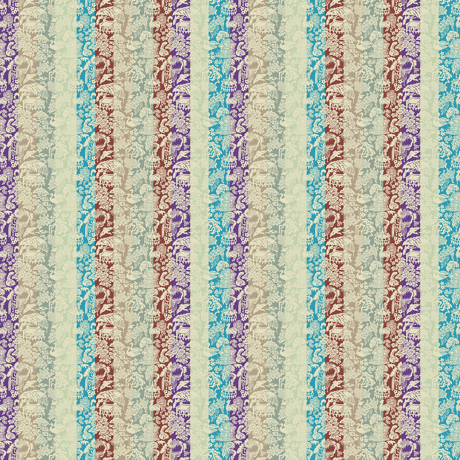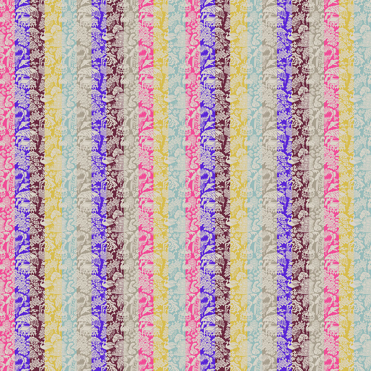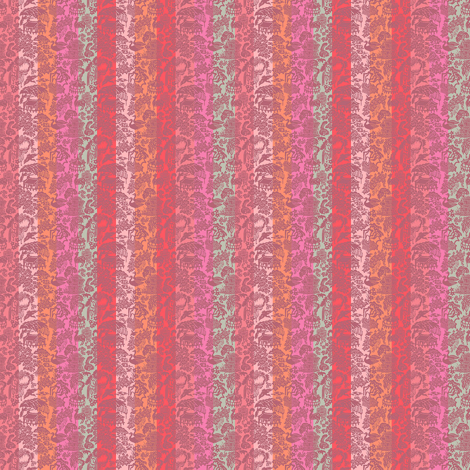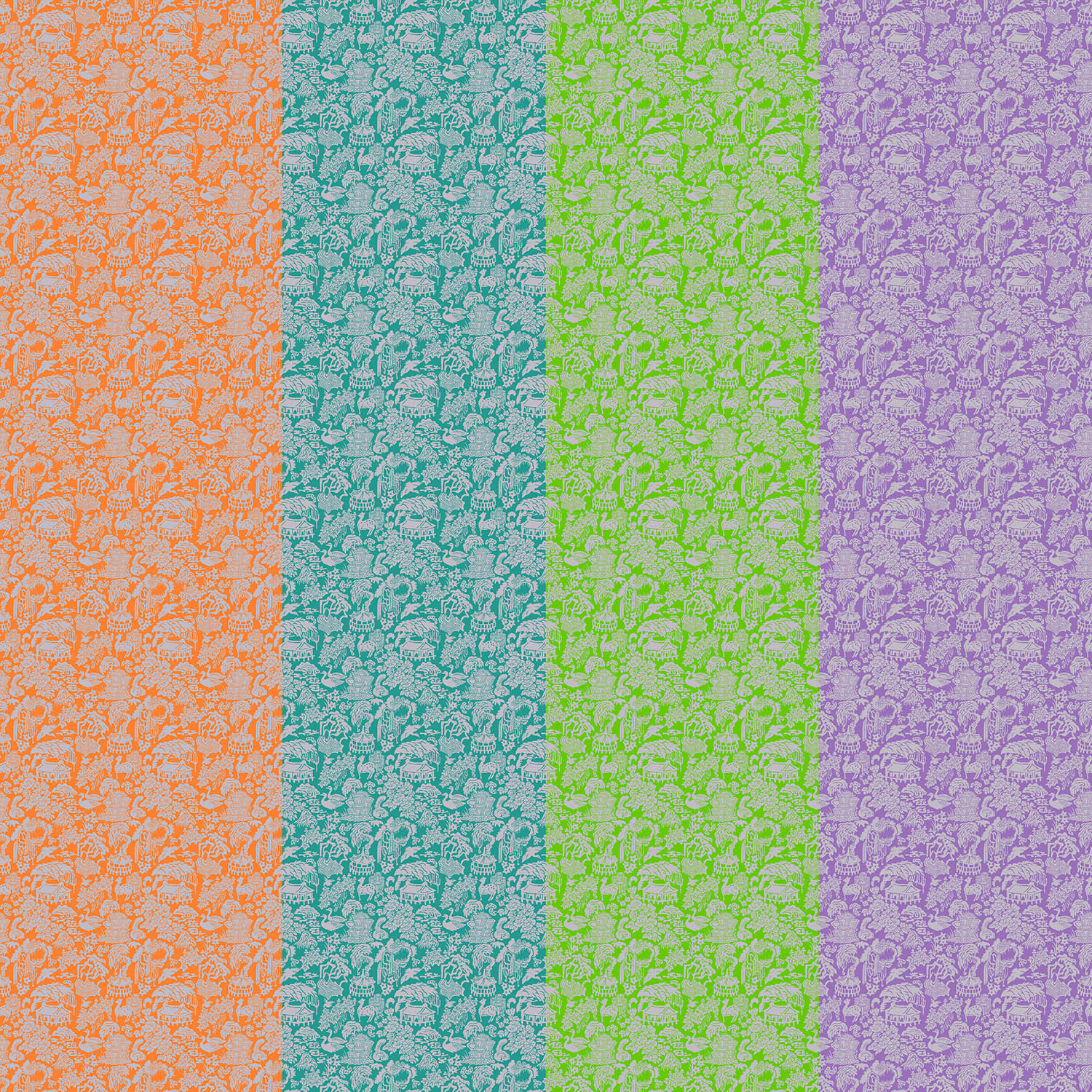 이 십장생의 상징적 의미를 무늬로 만들었다. 민화에 나오는 십장생을 보긴 했지만 그리 매력을 못 느꼈는데, 우연히 신설동 근처에서 자개 패를 종류별로 모아 파는 걸 보게 되었다. 그곳에 원하는 모양으로 자개를 잘라서 조각으로 판매하는 자개 가게가 있었다. 예전부터 널리 사용하던 무늬라 십장생 무늬의 자개 패가 있었다. 무늬를 모아서 다시 배치한 후 외곽선만 차용하고, 재커드 기법을 적용해 단색의 실크 재커드를 만들었다. 윤곽만 살려 놓고 다음 단계로 우리 전통색인 오방색에서 발전시킨 분홍, 보라, 고동, 노랑, 하늘, 은빛의 여섯 가지 색상을 적용해 율동적인 색동을 만들었다. 실제로는 하나하나 열 가지 사물이지만 불로장생이란 동일 주제로 묶인 십장생에 색동이란 장치를 더해 상징성을 더욱 강조했다. 다른 무늬와 달리 아홉 줄이 한 묶음으로 무늬가 되어 상하좌우로 반복되면서 힘이 더욱 강해지고, 무늬의 흐름이 만들어지므로 넓은 공간에서 더욱 효과를 발휘하는 무늬다.